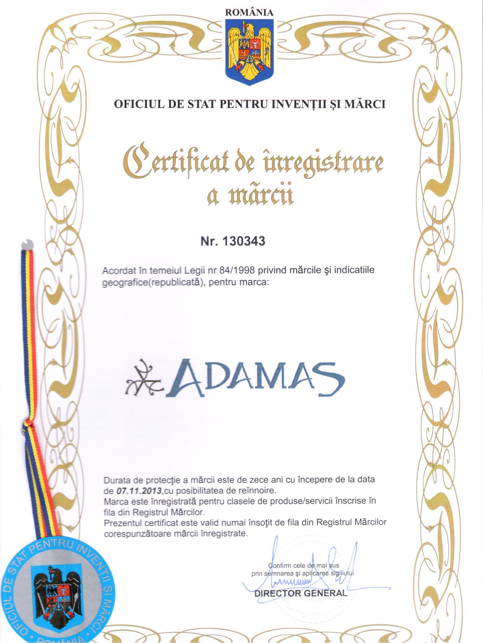 Adamas™ este marcă înregistrată la OFICIUL DE STAT PENTRU INVENȚII ȘI MĂRCI conform certificatului nr. 130343 din 07.11.2013.